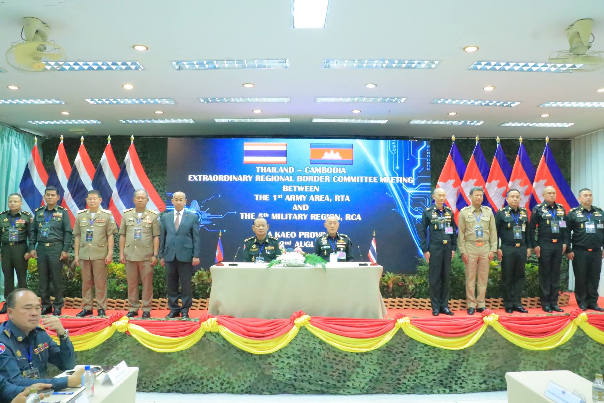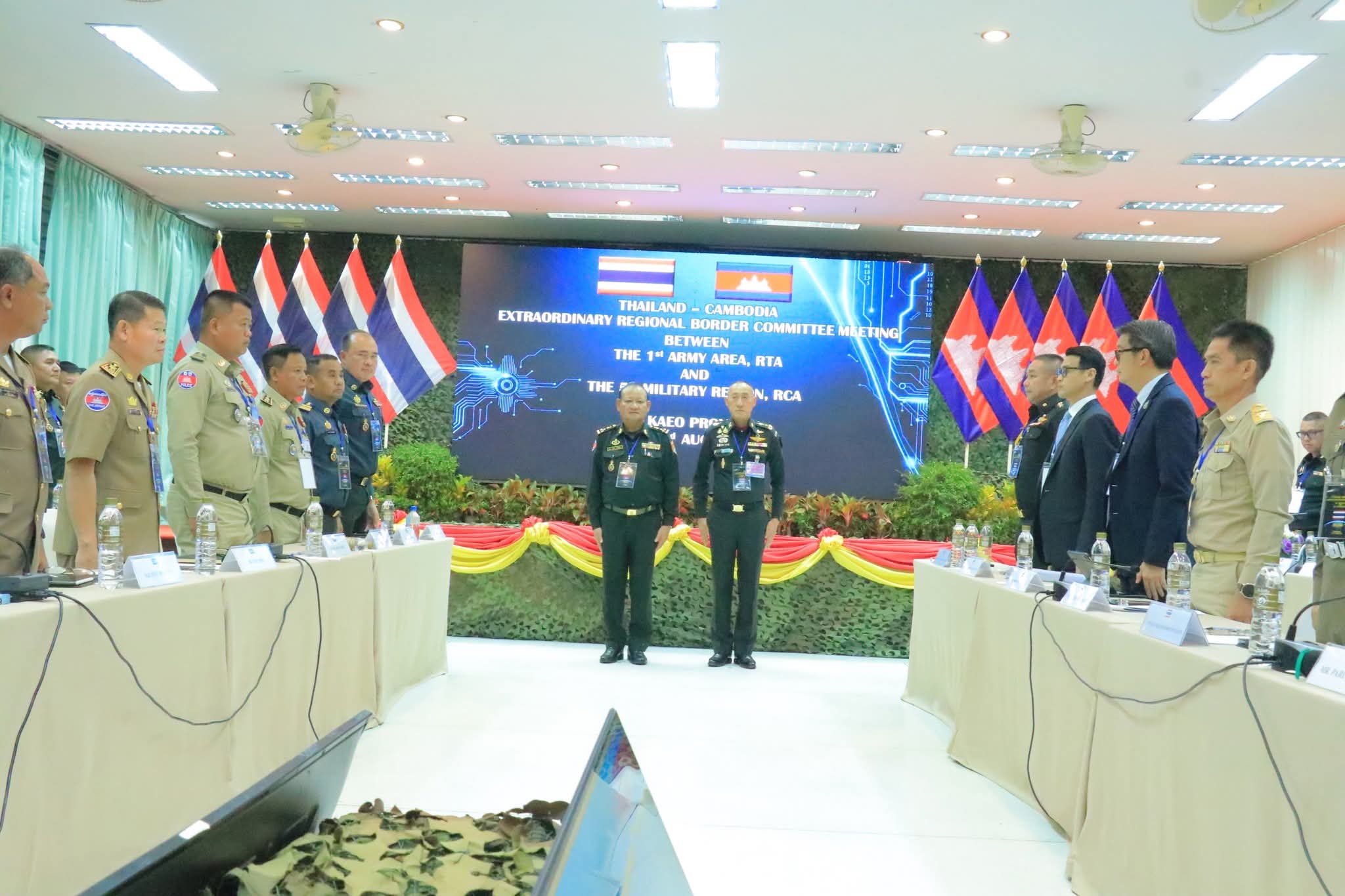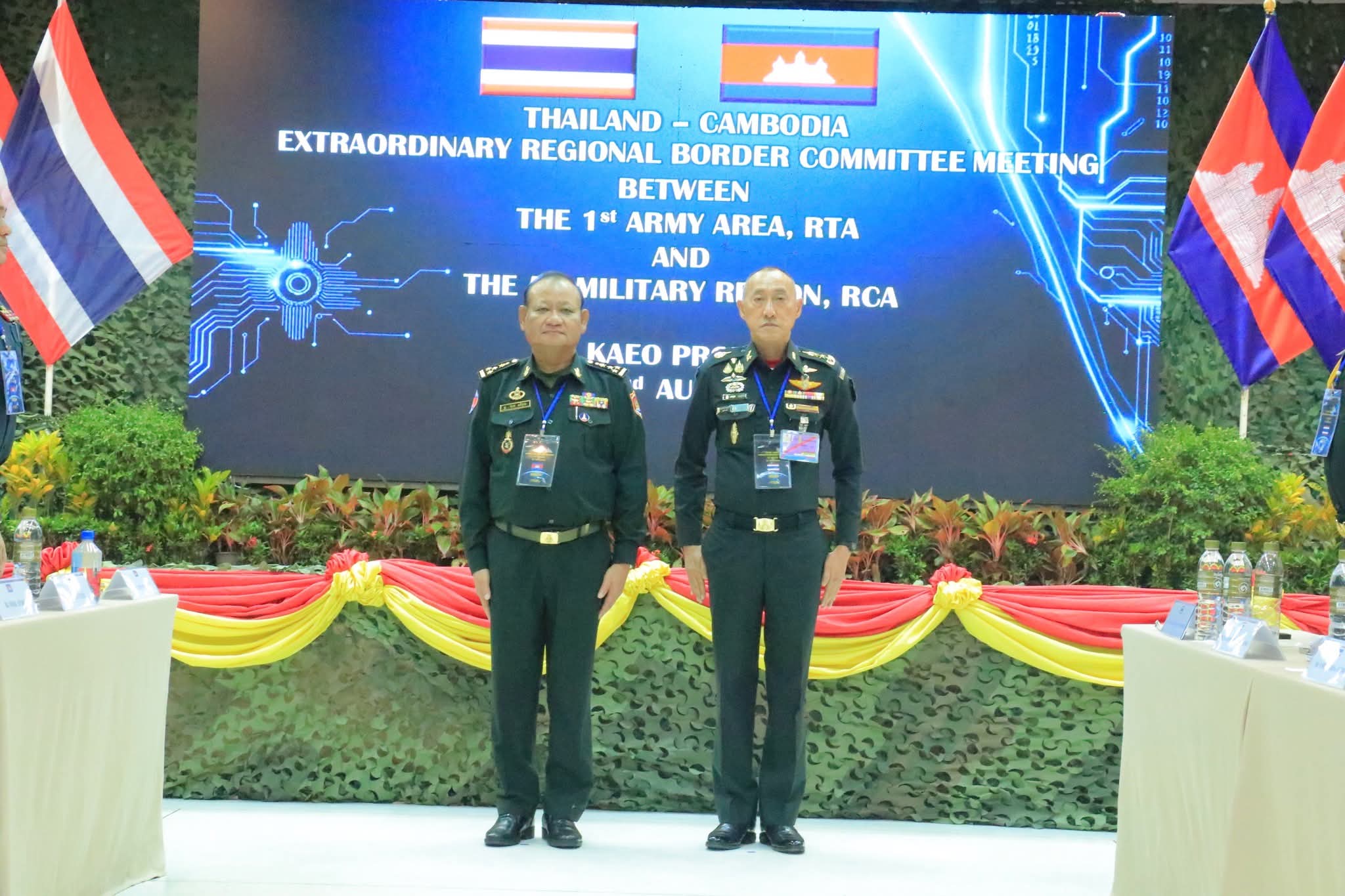 គណៈប្រតិភូកម្ពុជា ដឹកនាំដោយ ឧត្តមសេនីយ៍ឯក ឯក សំអូន មេបញ្ជាការយោធភូមិភាគទី៥ និងជាសហ ប្រធាននៃកិច្ចប្រជុំវិសាមញ្ញរបស់គណៈកម្មាធិការព្រំដែនថ្នាក់យោធភូមិភាគ (RBC)។ គណៈប្រតិភូថៃ ដឹកនាំដោយ ឧត្តមសេនីយ៍ឯក Amarit Boonsuya មេបញ្ជាការ កងទ័ពភូមិភាគទី១ និងជាសហប្រធាននៃកិច្ចប្រជុំវិសាមញ្ញរបស់គណៈកម្មាធិការព្រំដែនថ្នាក់យោធភូមិភាគ (RBC)។