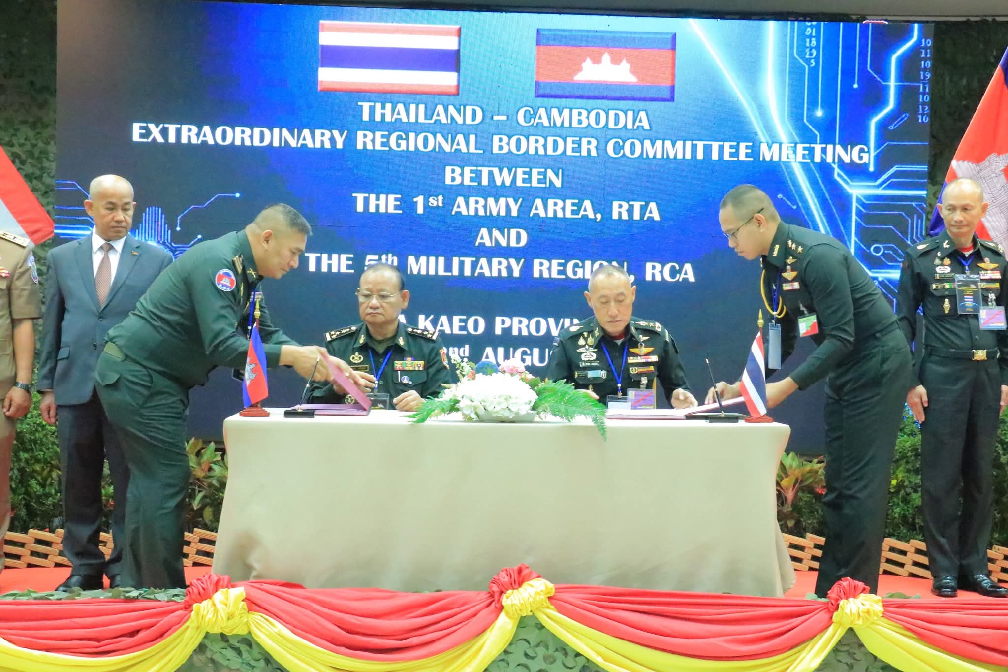 កិច្ចប្រជុំវិសាមញ្ញរបស់គណៈកម្មាធិការព្រំដែនថ្នាក់យោធភូមិភាគកម្ពុជា-ថៃ (RBC) បានបញ្ចប់ដោយជោគជ័យនៅវេលាម៉ោង១១:១៥នាទីព្រឹកថ្ងៃដដែល ដោយភាគីកម្ពុជា និងថៃបានបញ្ជាក់ពីការប្តេជ្ញាចិត្តយ៉ាងមុតមាំ ក្នុងការអនុវត្តបទឈប់បាញ់ និងគោល ការណ៍ឯកភាពទាំង១៣ចំណុច ការពង្រឹងបន្ថែមទៀតនូវទំនាក់ទំនងទ្វេភាគី និងការស្តារប្រក្រតីភាពឡើងវិញនៅតាមតំបន់ព្រំដែន។ ភាគីទាំងពីរក៏បានឯកភាពគ្នាក្នុងការរៀបចំកិច្ចប្រជុំបន្ទាប់របស់គណៈកម្មាធិការកិច្ច ការព្រំដែនថ្នាក់យោធភូមិភាគ (RBC) ក្នុងរយៈ ពេលមួយខែក្រោយកិច្ចប្រជុំវិសាមញ្ញនេះ ឬតាមពេលវេលាសមស្រប ដោយប្រទេសកម្ពុជាធ្វើជាម្ចាស់ផ្ទះ។