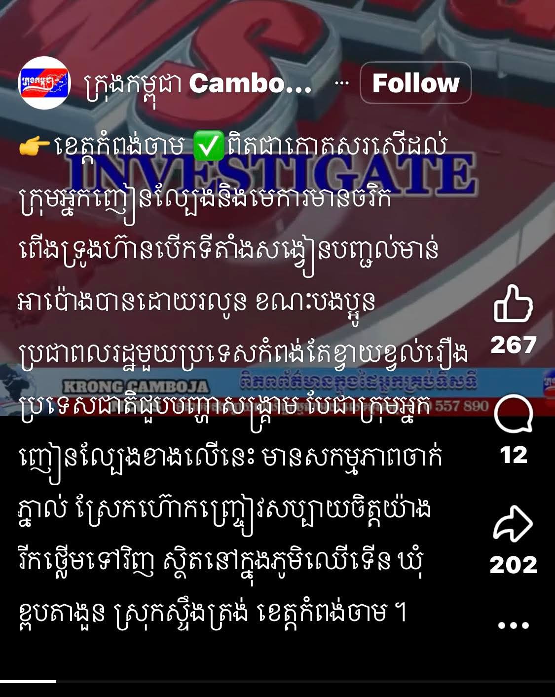 ភ្លាមៗនោះ ដោយអនុវត្តតាមបទបញ្ជាពី លោកឧត្តមសេនីយ៍ទោ ហេង វុទ្ធី ស្នងការនគរបាលខេត្តកំពង់ចាម កម្លាំងជំនាញ នៃអធិការដ្ឋាននគរបាលស្រុកស្ទឹងត្រង់ ដឹកនាំដោយលោកវរសេនីយ៍ឯក ឯម វឌ្ឍនា អធិការនគរបាលស្រុកស្ទឹងត្រង់ សហការជាមួយសមត្ថកិច្ចពាក់ព័ន្ធ ចុះស្រាវជ្រាវស៊ើបអង្កេតលើករណីនេះ ។ ជាលទ្ធផល ពេលកម្លាំងជំនាញចុះទៅដល់ទីតាំងខាងលើ ពិនិត្យឃើញមានដាន និងស្លាកស្នាមរយៈពេលប្រហែលពីរ ទៅបីថ្ងៃមុន ដែលមានក្រុមញៀនល្បែងលួចលាក់លេងល្បែងសុីសងជល់មាន់ភ្នាល់ដាក់ប្រាក់ចល័តតាមព្រៃចម្ការ។